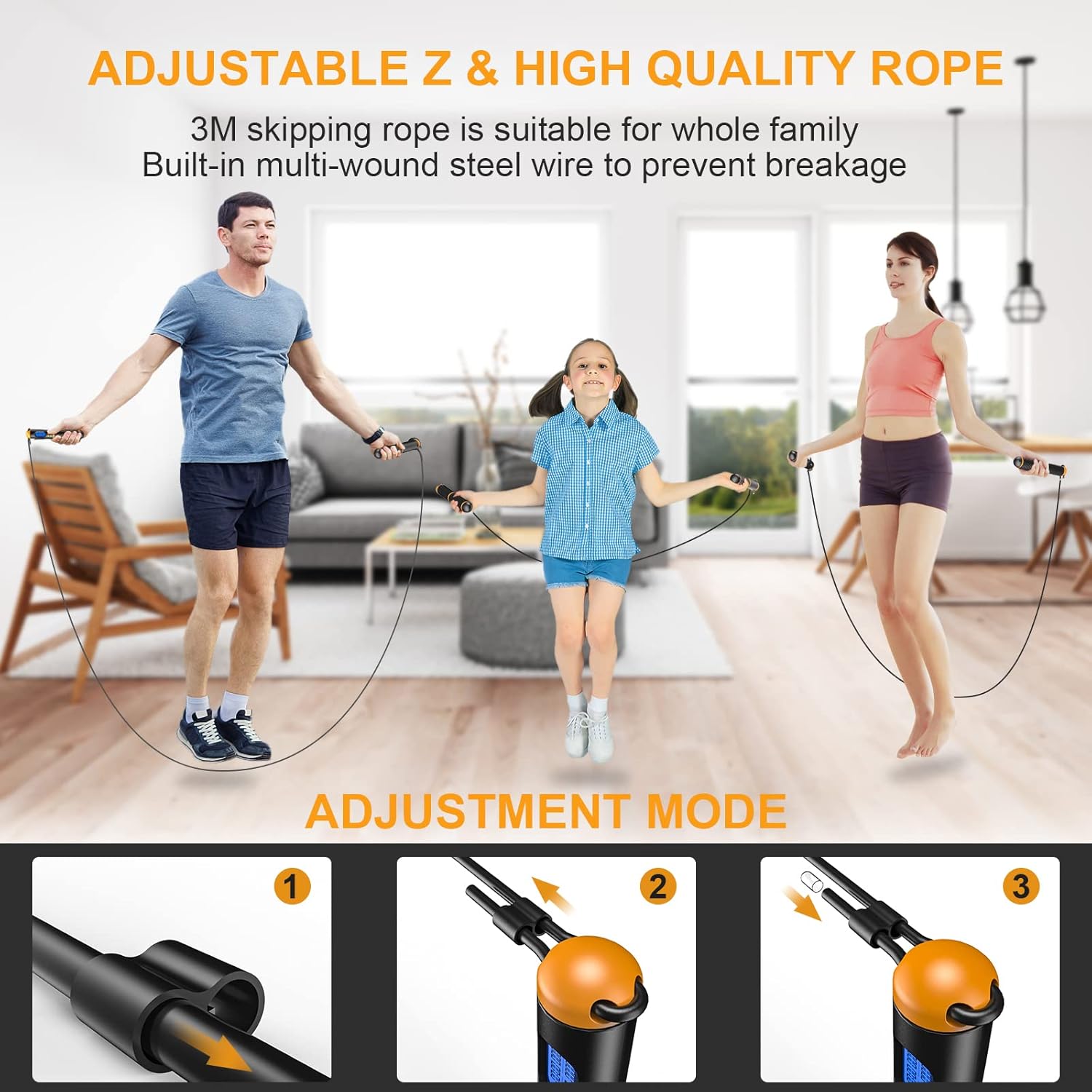A smart jump rope that tracks weight, laps, time, and calories with a built-in digital counter. Features both adjustable rope and cordless modes, making it perfect for home workouts for men, women, and kids.